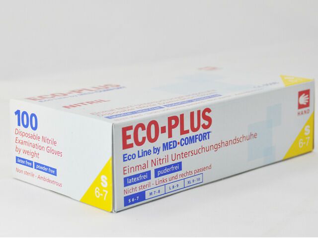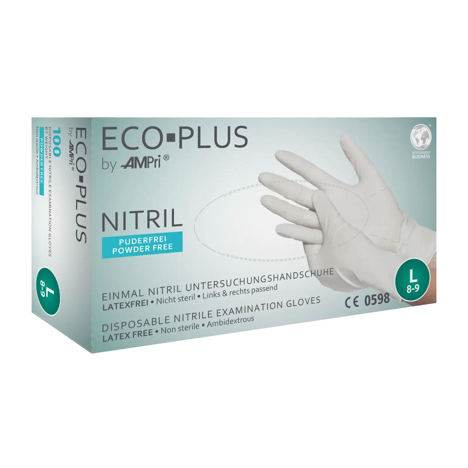Eco-Plus -nitriilikäsineet terveydenhuollon toimenpiteisiin. Tutkimuskäsineiden teksturoitu pinta takaa hyvän pidon. Puuteriton. Väri: valkoinen. Laatustandardit: EN 455-1:2000, EN 455-2:2015, EN 455-3:2015, EN 455-4:2009, EN ISO 374-1:2016+A1:2018, EN ISO 374-4:2019, EN ISO 374-5:2016, EN 420:2003+A1:2009.