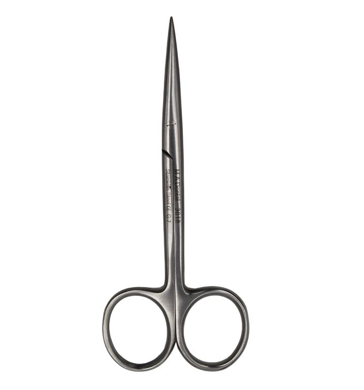 Klassinen, monikäyttöinen saksimalli kirurgisiin toimenpiteisiin (mm. ommelten poisto, kudosten trimmaus). Pituus: 11,5 cm. Malli: suorat kärjet. Valmistusmateriaali: ruostumaton teräs.