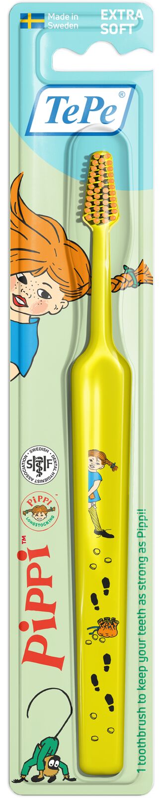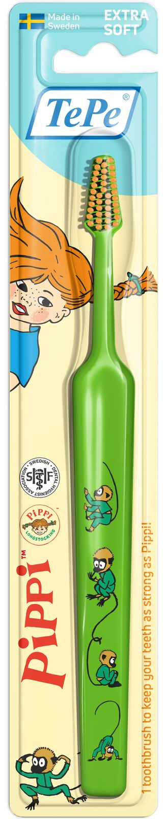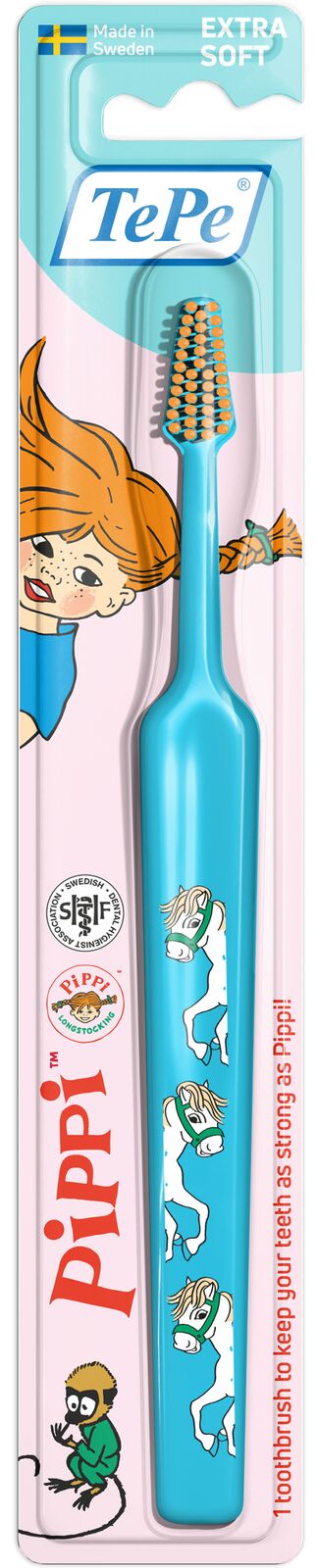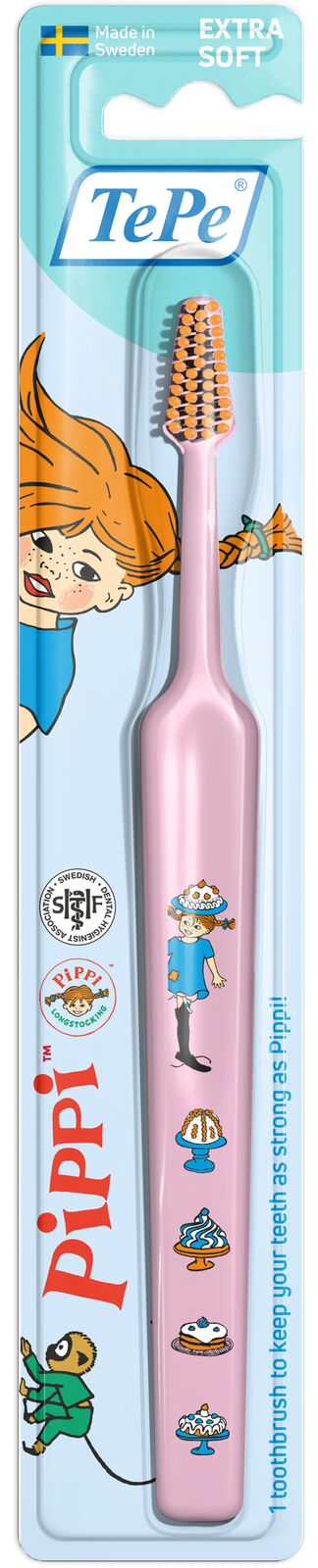 TePe Kids -hammasharjat on kehitetty tehokkaaseen ja hellävaraiseen hampaiden puhdistamiseen yhteistyössä hammashoidon asiantuntijoiden kanssa. Kapeneva harjaspää helpottaa vaikeisiin paikkoihin pääsyä ja pyöristetyt harjakset puhdistavat hellävaraisesti. Hammasharjan tavallista pienemmässä ja ergonomisessa varressa on leikkisä Peppi Pitkätossu-teema. Hammasharjan kaulaosan voi lämmittää kuumassa vedessä ja taivuttaa sopivaan kulmaan.