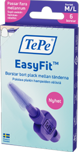 TePe EasyFit™ on kartionmuotoinen hammasväliharja, joka puhdistaa tehokkaasti hammasvälit, joihin tavallinen hammasharja ei ylety. TePe EasyFit -hammasväliharja mukautuu erikokoisiin hammasväleihin kartiomaisen muotoilunsa ansiosta. Poistaa tehokkaasti plakkia hampaiden välistä ja auttaa ehkäisemään ientulehdusta, kariesta sekä pahanhajuista hengitystä. Pehmeät harjakset hammasväliharjan yläosassa tekevät hammasväliharjasta hellävaraisen päivittäiseen käyttöön.