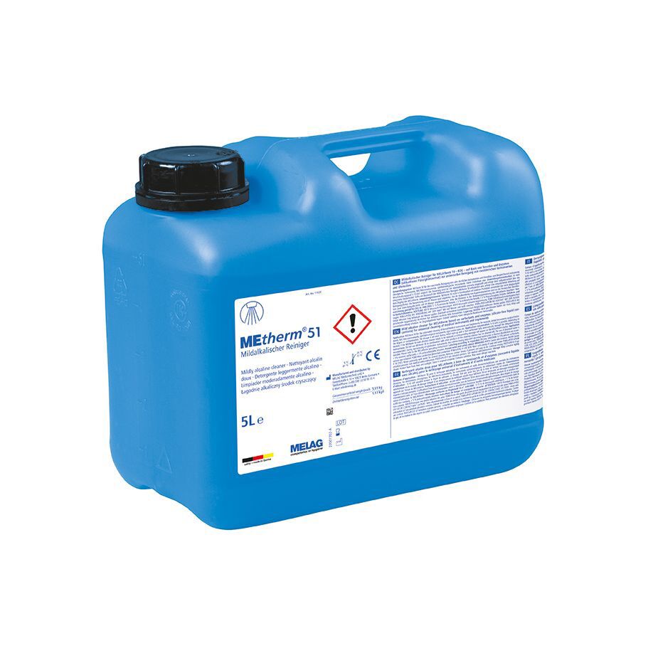 Melagin MEtherm 51 on mieto, emäksinen pesuaine automaattiseen instrumenttien jälleenkäsittelyyn MELAtherm-pesukoneille. Erinomainen puhdistusteho saavutetaan entsyymien ja pinta-aktiivisten aineiden yhdistelmällä. MEtherm 51 uusi koostumus on entistäkin tehokkaampi (korvaa tuotteen METherm 50).