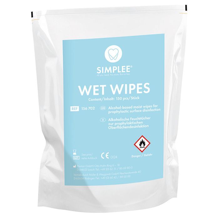 SIMPLEE Wet Wipes AF alkoholipohjaiset, käyttövalmiit desinfiointiliinat sopivat lääkinnällisten laitteiden ja pintojen nopeaan desinfektioon. Nopeavaikutteiset puhdistusliinat soveltuvat kaikille alkoholia kestäville pinnoille. Peruspakkauksessa tulee mukana kätevä annosteluastia.