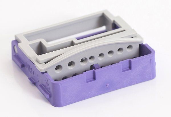 Porateline Practipal -tarjottimeen. Poratelineeseen mahtuu 2 pitkää poraa, 5 kulmakappalekiinnitteistä poraa ja 8 turbiinikiinnitteistä poraa. Vähentää pistotapaturmia ja helpottaa instrumenttien huoltamista sekä erilaisten kokoonpanojen toteuttamista.
