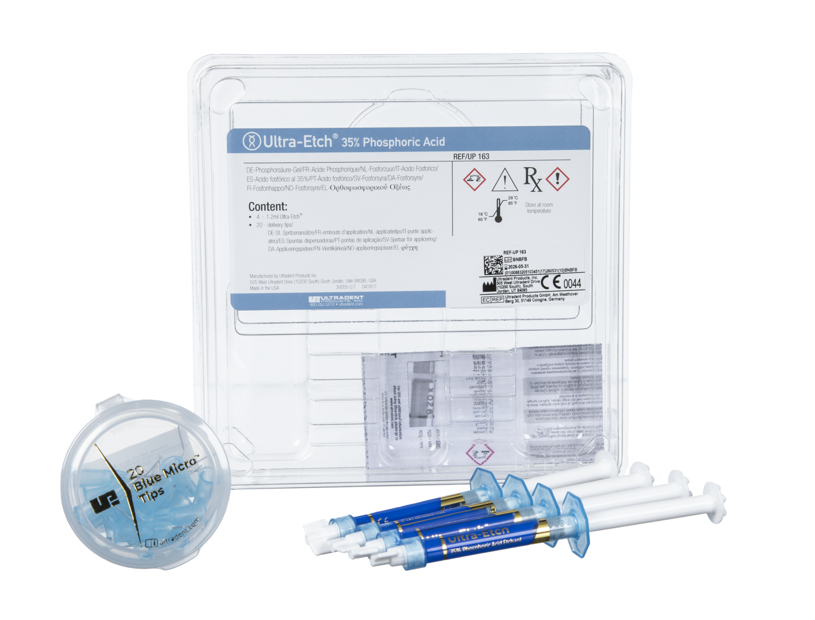 35 % fosforihappo. Ihanteellinen viskositeetti, joka helpottaa tarkkaa applikointia. Pakkaus sisältää: 4 kpl Ultra-Etch -ruiskuja 1,2 ml, 20 kpl Blue Micro -kärkiä.